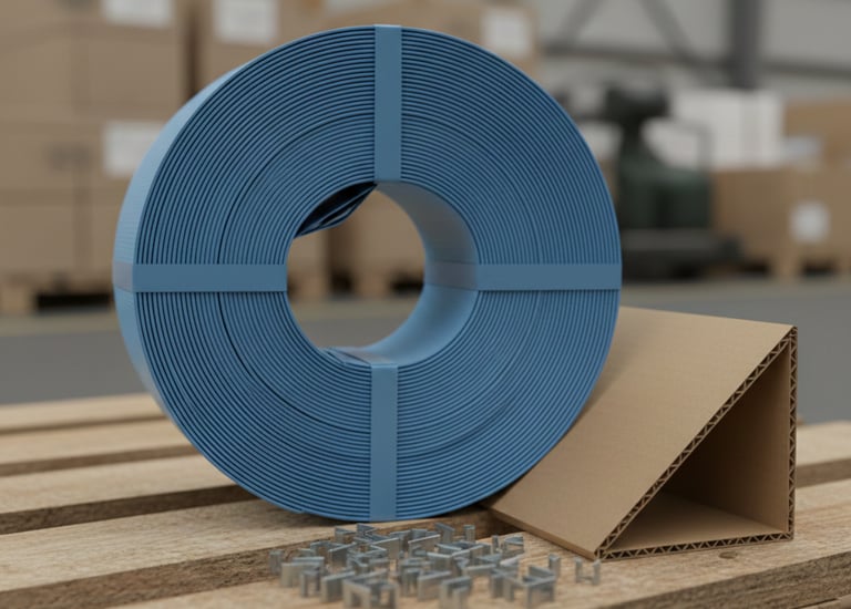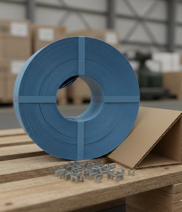 Fleje y grapas para asegurar el transporte seguro de mercancías.